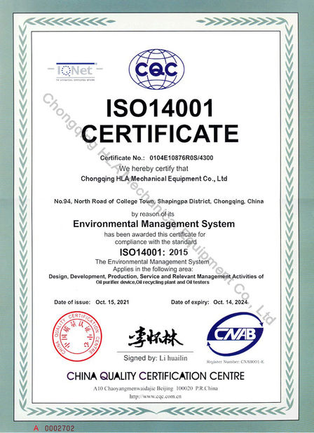 Standard:ISO14001 Number:0104E10876R0S/4300 Issue Date:2021-10-15 Expiry Date:2024-10-14 Scope/Range:Design,Development,Production,Service of Oil Purifier Equipment Issued By:CQCC |